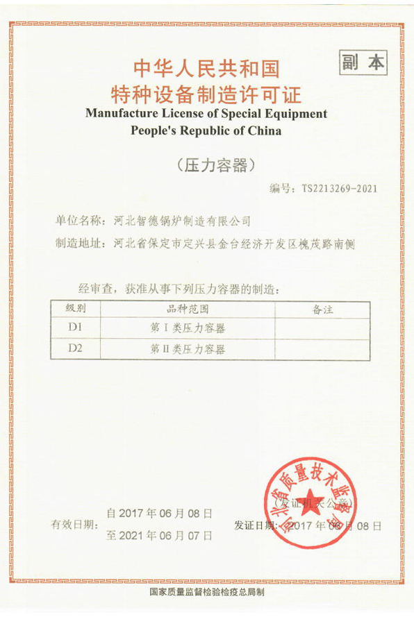 經(jīng)審查,獲準從事第Ⅰ類壓力容器和第Ⅱ類壓力容器的制造。